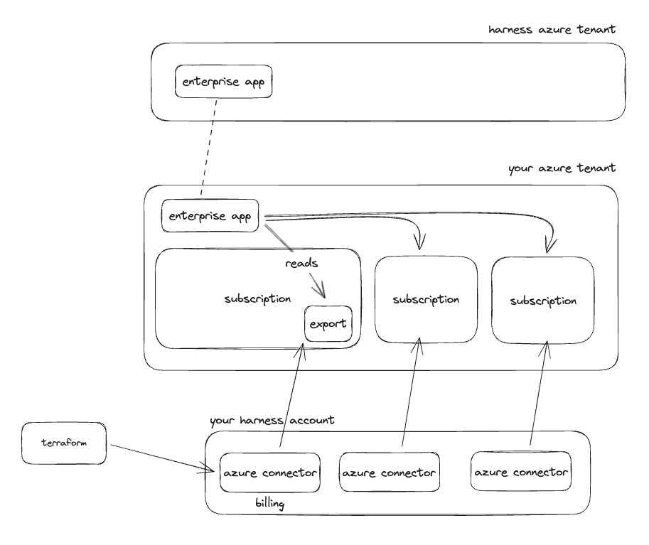 Enabling CCM for your subscription that holds the billing export gets your cost data into Harness and enables you to start creating perspectives, budgets, alerts, and dashboards. To leverage the other features like auto stopping, and recommendations we need to give access and create connectors for each subscription where you want to use these other features.